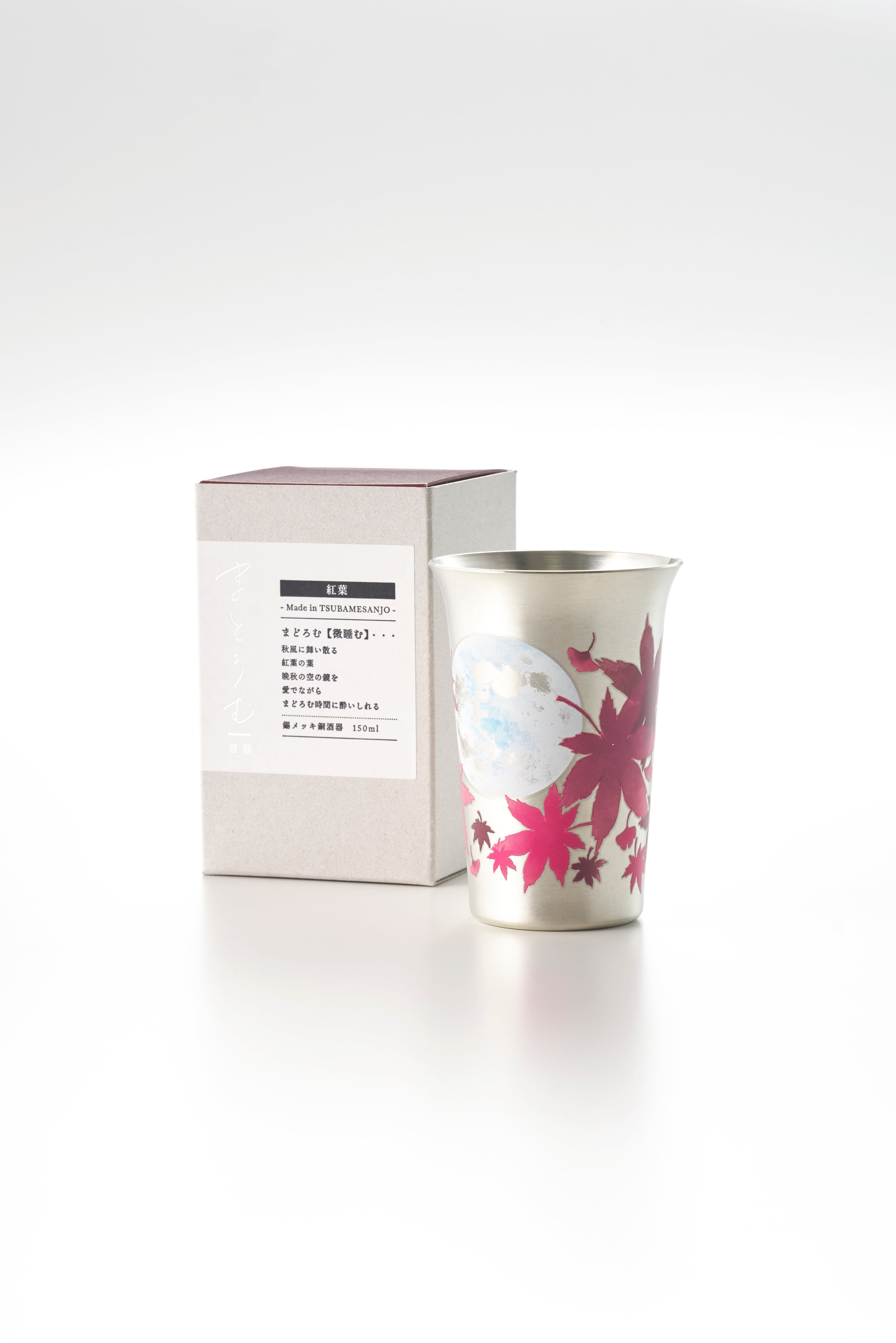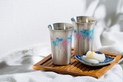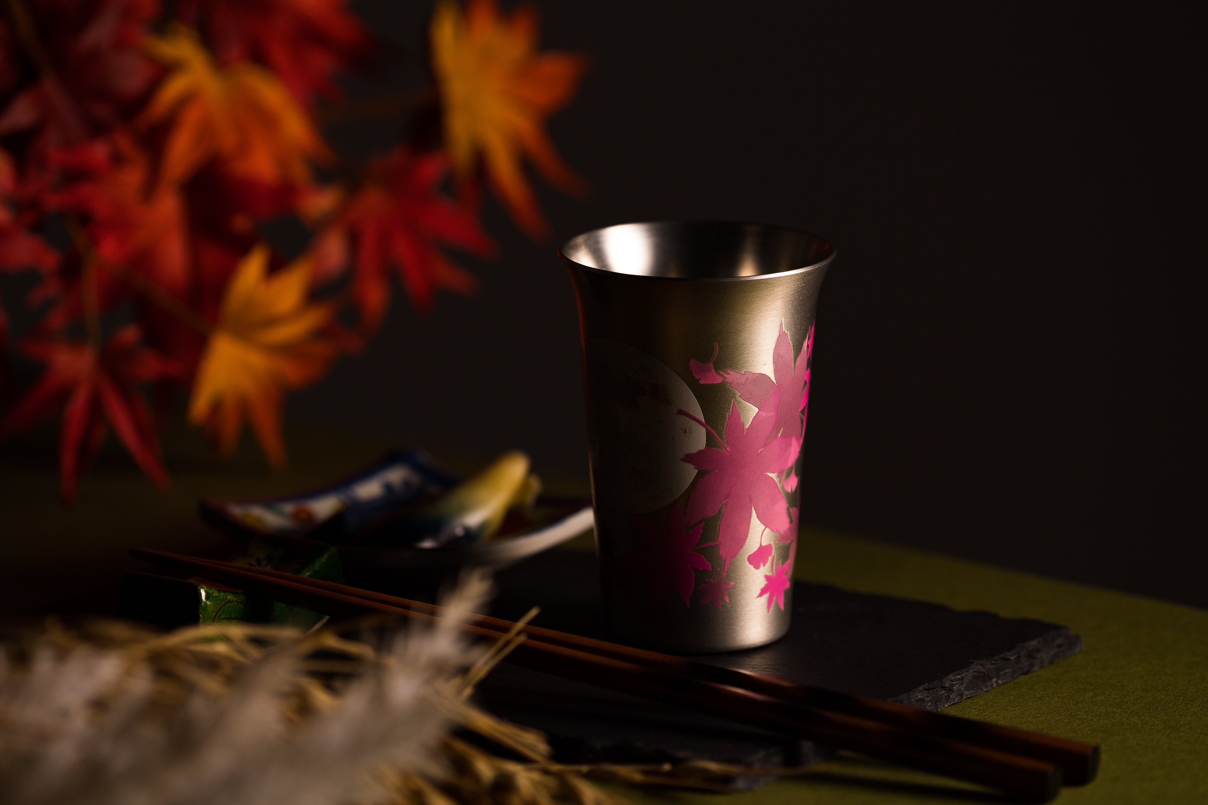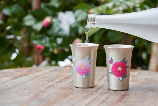 まどろむ酒器は、銅に錫でコーティングされた金属製の酒器に、約16℃以下の冷たい液体を入れることで絵柄が色づき季節の風物詩を愉しんで頂ける酒器です。