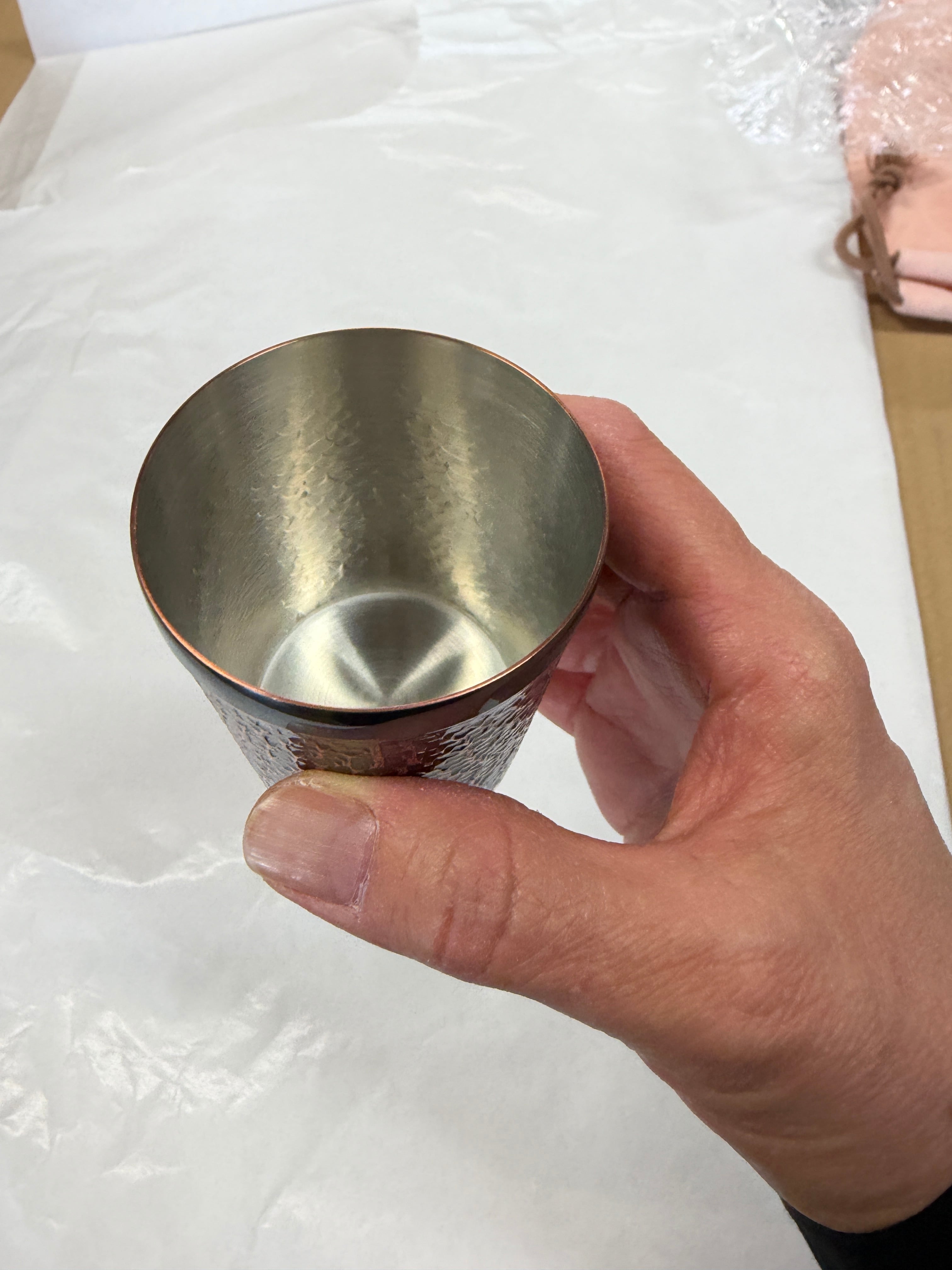 この純銅ぐいのみは、職人が手打ちで仕上げました。