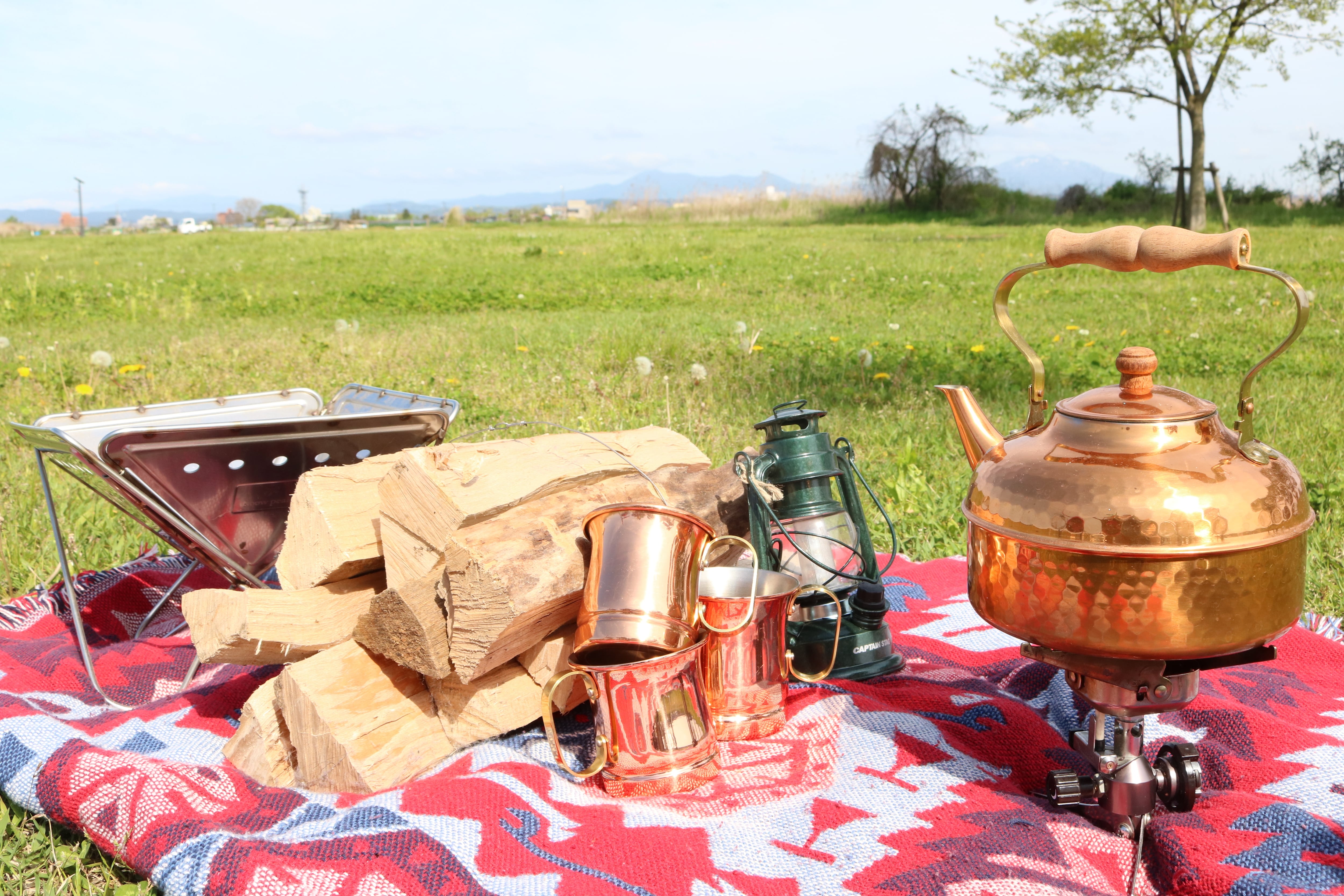 アウトドアシーンで存在感抜群の銅製やかん、銅の湯沸かしは伝統的で王道です。