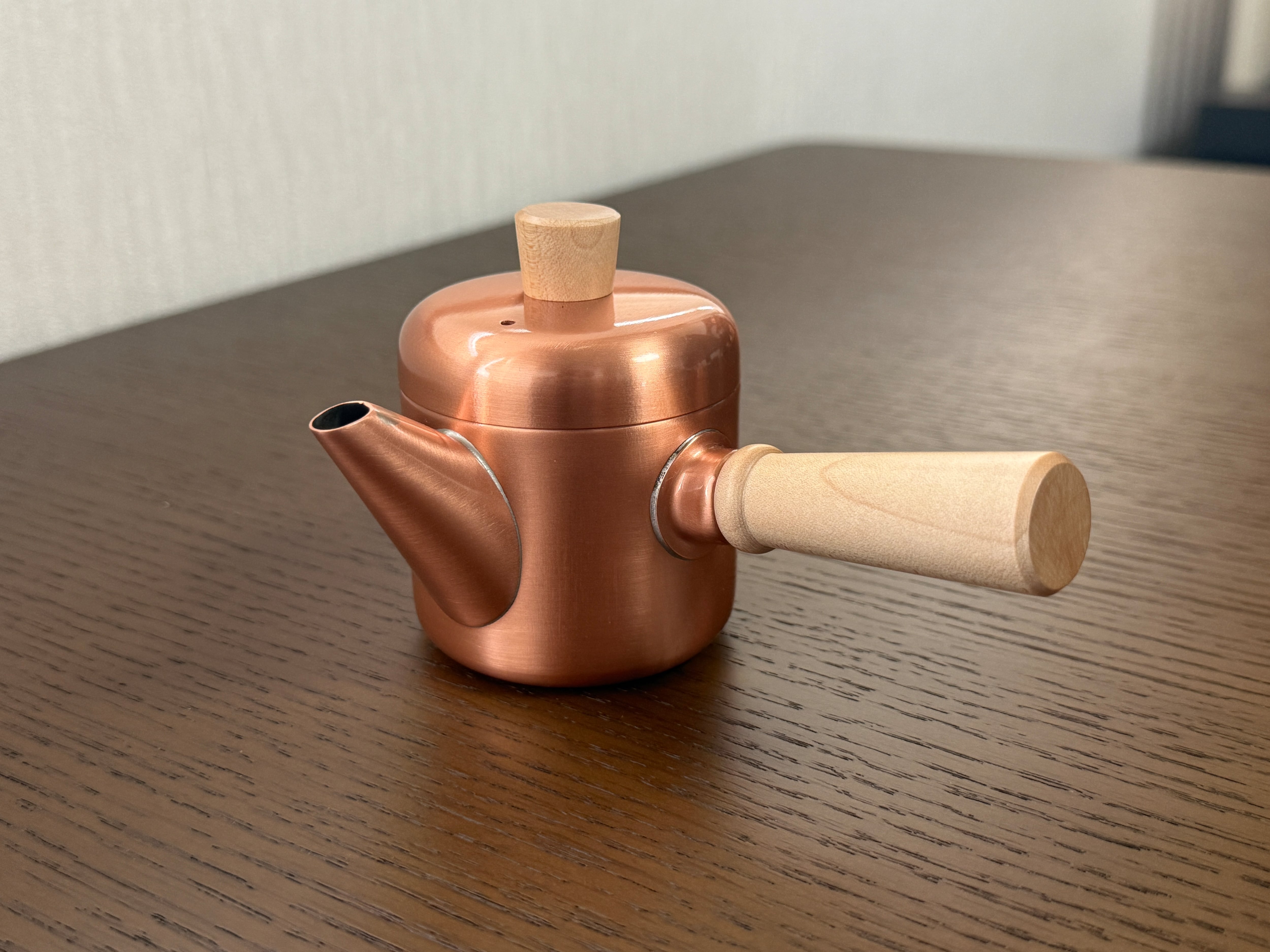 ◇商品について◇ MK-01携帯急須は、持ち運びに便利なミニサイズの銅製急須です。手軽にお茶を楽しむことができ、家庭でのティータイムはもちろん、アウトドアや旅行でも重宝します。その美しい素材感が、どんなシーンでもおしゃれさを引き立てます。 ◇銅の良いところ3選!◇ 1. 熱伝導性 銅は非常に高い熱伝導性を持つため、急須内のお湯を素早く均一に温めることができます。これにより、お茶の旨味を最大限に引き出します。 2. 抗菌性 銅には優れた抗菌性があり、衛生的にご使用いただけます。お茶の淹れ方にも安心感をプラスします。 3. 耐久性 銅は腐食に強く、適切なお手入れをしていただければ長い間ご愛用いただけます。時間が経つにつれて味わいが増すのも銅製品の魅力です。